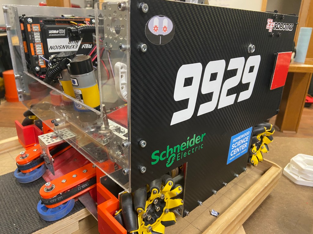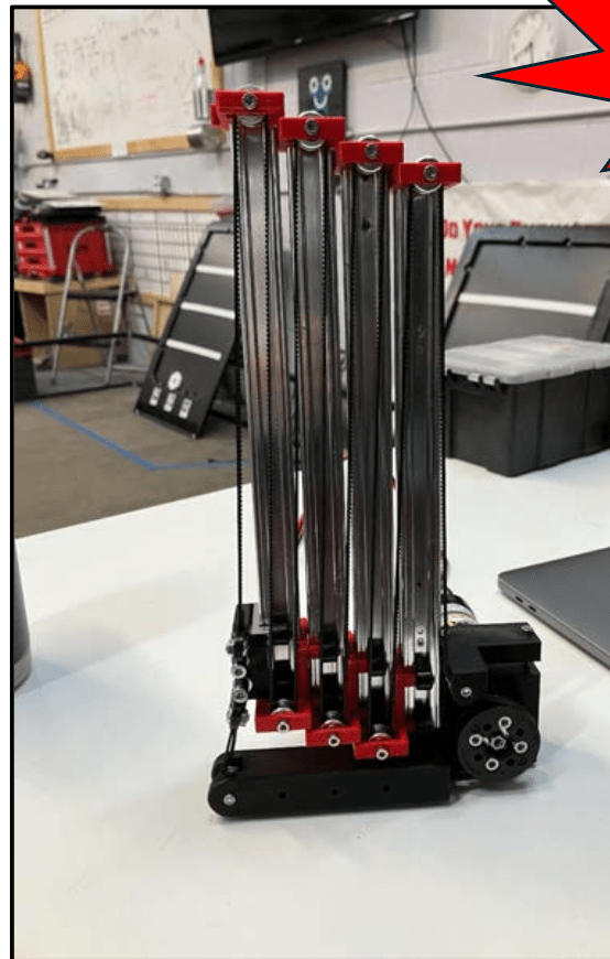 We decided to use a belt lift instead of a chain lift as used in Skystone. Belt lifts are lighter than chain lifts since there are fewer parts and heavy materials weighing them down. We decided from the beginning of the season that we were going to try to maximize how big our robot could be based on the amount of mechanisms necessary to complete all the challenges. All those mechanisms add weight to the robot, so we needed to use a lighter lift. The belt is also in one piece, and so it is easier to repair. It is also easier to make adjustments to a belt lift.